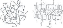 Quand on fabrique un objet ou un emballage, le mode de mise en œuvre (extrusion, injection, calandrage, etc.) confère au polymère une certaines structure à l’échelle microscopique : il peut être amorphe (à gauche de l’image), cristallin (rare) ou semi-cristallin (la majorité des cas, à droite de l’image).