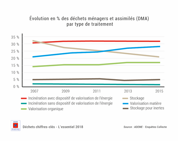 Pour précision, la plupart des chiffres de cet article viennent de l’ADEME. Petit point sur l’évolution du % des déchets ménagers par type de traitement avant d’attaquer le sujet. Et une infographie représentant la destination de tous les déchets produits (ménages, entreprises et construction).