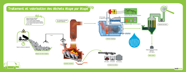 Petit schéma bien fait par Savoie Déchets. Si vous voulez des détails ils ont des schémas très bien faits sur l’incinération ici.