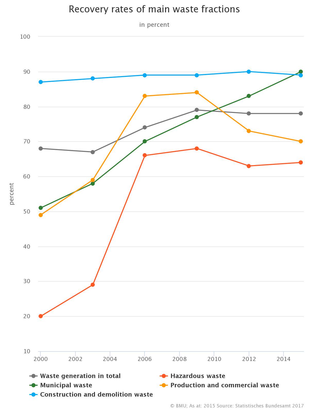 L’Allemagne a commencé à s’attaquer à la problématique des déchets non dangereux dans les années 80, notamment avec la réduction des taux de déchets mis en décharge et le choix du recyclage comme solution au problème de la gestion des déchets. Fin des années 80, début 90, l’opinion publique allemande est contre l’incinération et la mise en décharge des déchets. Ce qui pousse le gouvernement allemand à mettre en place des mesures plus incitatives pour les industriels et le consommateur