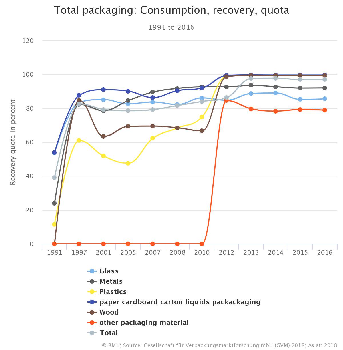 En 1991, le Décret Toepfer impose aux industriels de prendre en charge le recyclage de leurs emballages en deux étapes, avec des taux de recyclage prédéfinis : 50% de collecte des emballages en 1994 et 80% de collecte en 1995. Cela a engendré une nécessité de tri des emballages chez le consommateur entre autres, qui explique aussi les habitudes prises par les allemands de trier sérieusement leurs déchets. Le décret Toepfer a également imposé d’autres contraintes aux industriels qui mettent sur le marché des produits emballés, notamment dans la reprise des emballages secondaires et de transport.