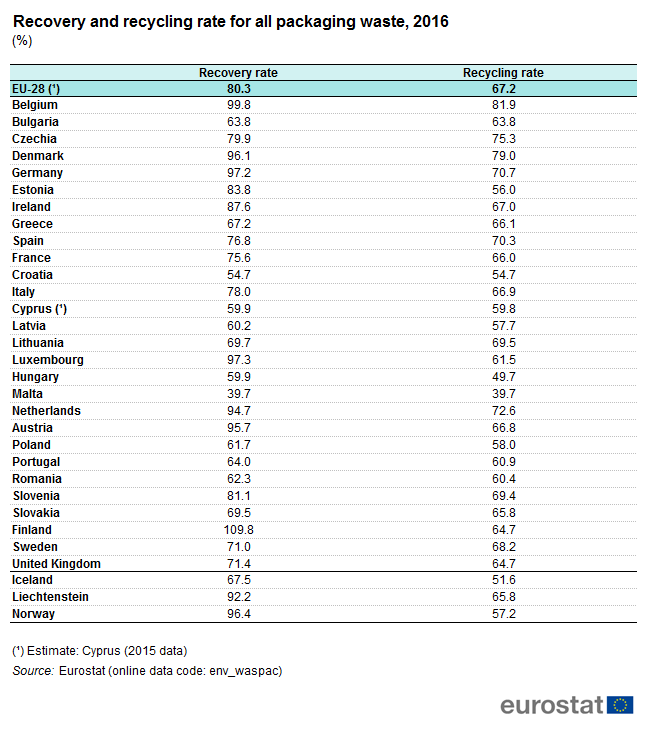 Au niveau européen, il se situe parmi les pays les plus engagés dans la valorisation des déchets comme le montre ce tableau (source Eurostat, 2016) qui représente la valorisation des emballages : l’Allemagne valorise bien plus ses emballages que la France.Les chiffres de 2016 ont un peu évolué, mais je trouvais que ce tableau permettait de bien situer les pays les uns par rapport aux autres.