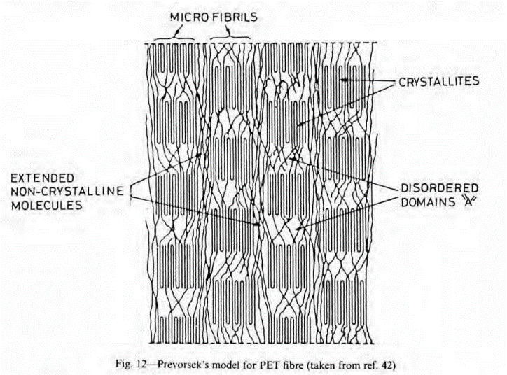 Une petite explication sur les fibres en PET (polyester ou polyéthylène téréphtalate) : leur fabrication se fait par étirage du plastique fondu. On obtient un fil constitué de molécules étirées, orientées et organisées en phases cristallines, amorphe et mésomorphe . Un petit schéma d’explication (Model de Prevorsek):