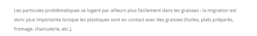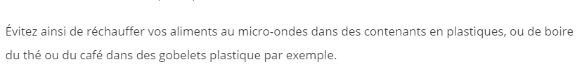 On ne chauffe pas un plastique qui n’est pas fait pour. Les conditions de chauffe sont précisées : four, micro-onde, température, puissance max. Là-dessus ils ont raison. MAIS ils parlent du danger des plastiques en utilisant des données spécifiques à la dégradation thermique. Dans cet extrait, ils parlent de café ou de thé dont la température ira jusque 90°C, sachant que les gobelets en plastique pour le café sont en polystyrène (PS) et que sa température de dégradation est à 230°C. Donc l’affirmation de l’article n’est pas justifiée ici.