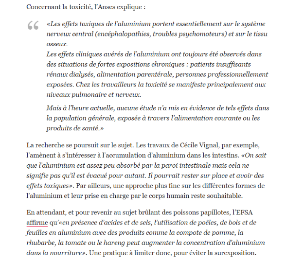 Le 2e cas est traité par le site d’un certain Anthony Bertheux qui présente les dangers de l’aluminium en citant les emballages, en expliquant pourquoi ils sont dangereux mais en ne citant aucun article associé, malgré la longue liste de sources qui donne l’impression de sérieux Donc oui, l’aluminium sous sa forme de feuille peut migrer vers l’aliment dans certaines conditions bien précises (température, acidité etc.) mais il n’a pas été démontré qu’il avait des effets plus néfastes que l’aluminium naturellement contenu dans les aliments ou ajouté. Je n’ai trouvé que des interviews de l’ANSES et l’EFSA mais pas de document récent sur le sujet. Une inteview chez CheckNews.