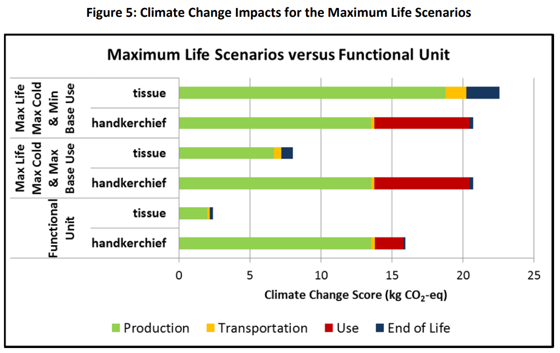 Elle se base sur plusieurs mix énergétiques en fonction des pays de production, avec une utilisation des mouchoirs aux USA. Les auteurs ont comparé l’utilisation de mouchoirs en coton vs papier jetable sur une année.