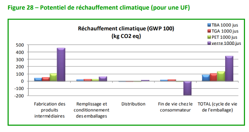 L’impact environnemental des bouteilles de jus de fruit est donc présenté de cette manière. On voit bien que la fabrication des produits est très impactante quel que soit le matériau, mais surtout pour le verre qui est également comparé.