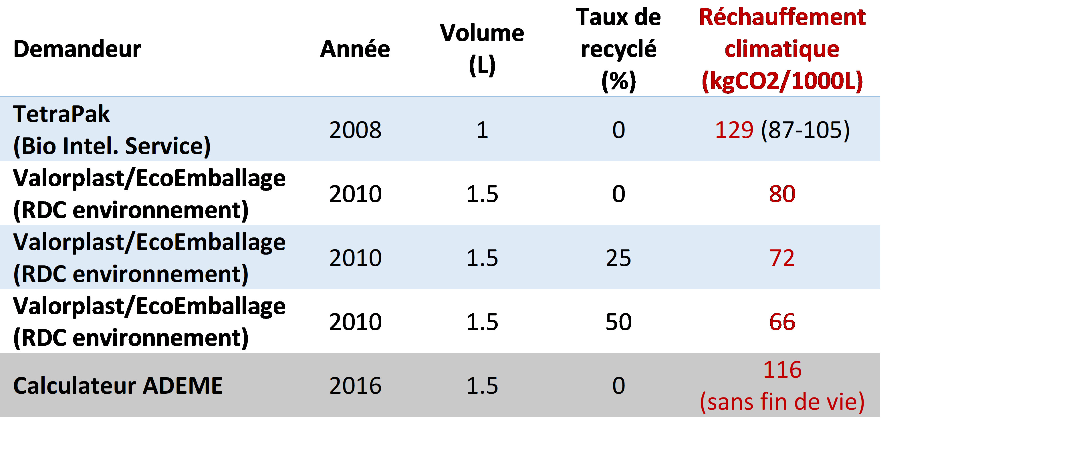 L’étude de Valorplast qui prend en compte le recyclage donne des valeurs bien plus basses. Elle est cohérente avec le calculateur ADEME qui ne prend pas en compte les bénéfices du recyclage sur l’ACV. Lien vers l’étude valorplast : valorplast.com/wp-content/upl…