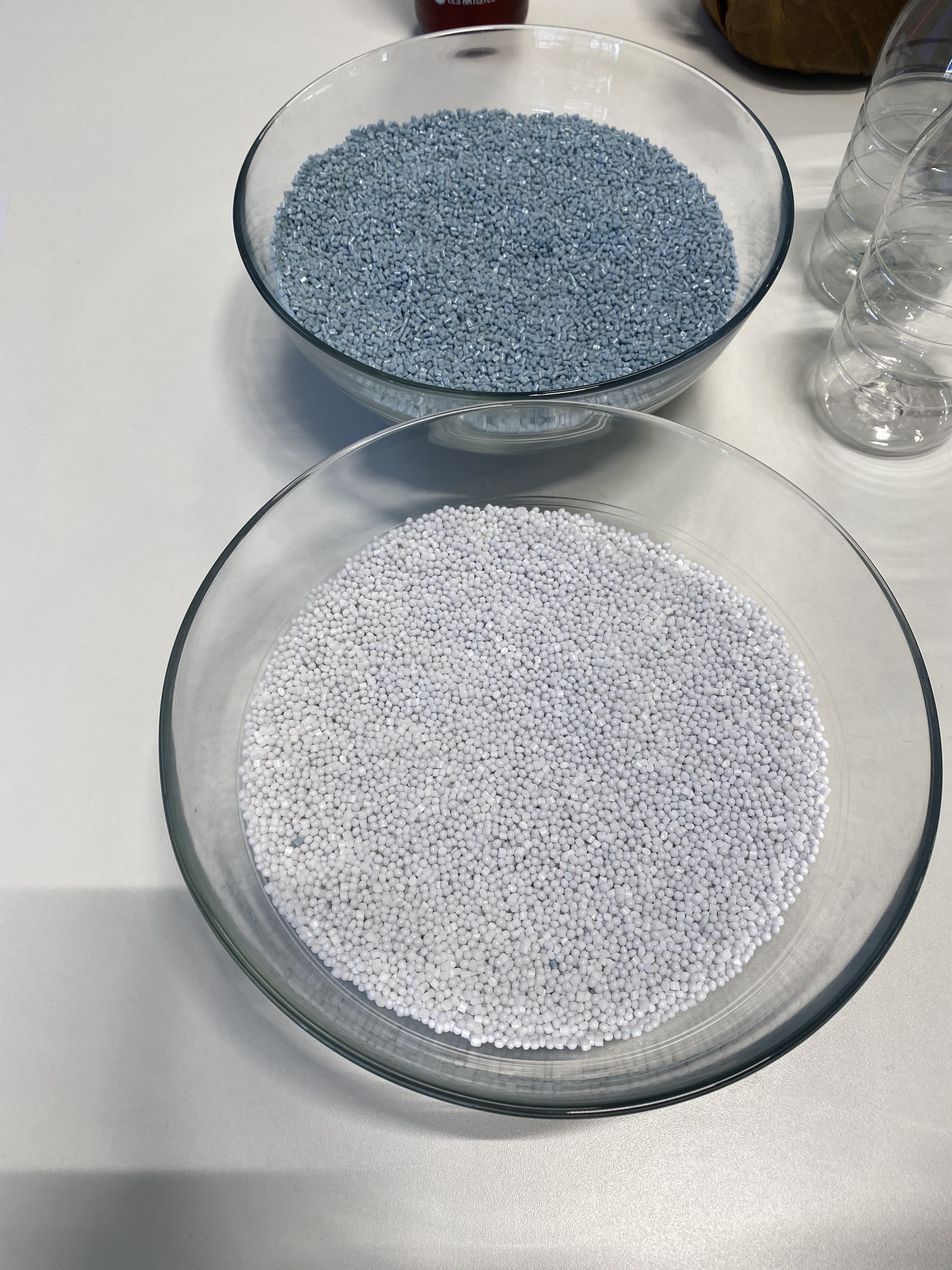 Les autres sont rebutées pour être recyclées dans une filière non alimentaire (fibres par exemple). Voici une photo de granules de PET vierge (bas) et recyclé (haut). La matière recyclée est légèrement bleutée, ce qui n’a pas d’impact sur la qualité du matériau après recyclage.