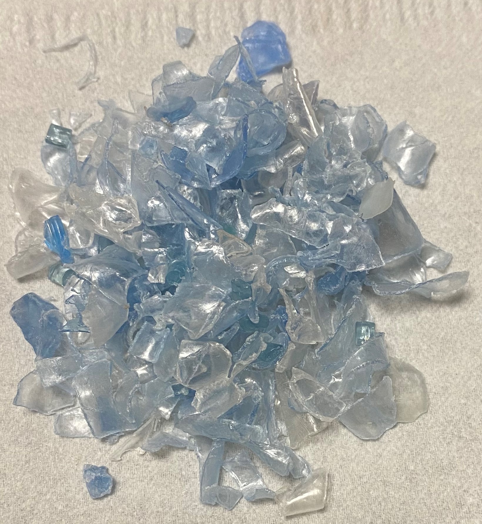 Un tri optique réglé sur un rayon de 2mm permet de retirer les petits éléments colorés. L’objectif est bien d’obtenir une matière la plus homogène et claire possible, légèrement bleutée. les paillettes une fois triées 😍