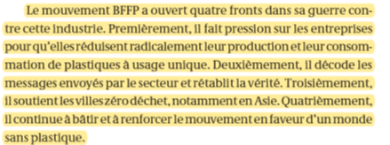 Le vocabulaire est agressif, guerrier je dirai. C’est une lutte contre l’industrie qui est décrite. Et contre le plastique. Pas contre la pollution. C’est donc un mouvement qui est décrit, usant du lobbying de la même manière que ceux qu’ils accusent.