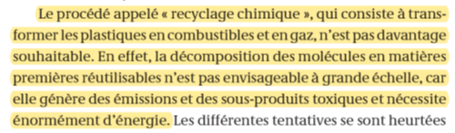 Ils confondent avec la pyrolyse parfois associée au recyclage chimique. Il n’est pas très utilisé pour des questions de coût mais il n’émet pas de produits toxiques. Mais il serait réducteur de parler de recyclage chimique en présentant uniquement la pyrolyse. C’est un exemple de non-compréhension du sujet.