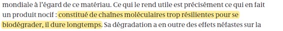Il est dit ici que les plastiques ont « une durée de vie presque infinie ». Les plastiques peuvent se dégrader rapidement en fonction des conditions d’exposition. Il n’y a pas d’infini sauf à l’échelle moléculaire. Mais notre existence serait également infinie.