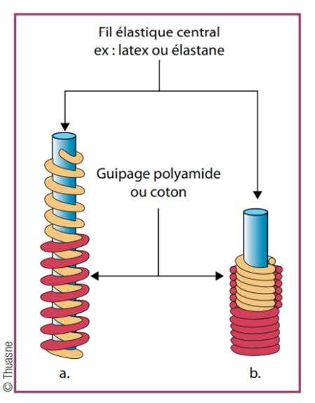 Un fil de haute qualité est obtenu par un procédé appelé guipage, qui permet d’enrouler le fil principal par d’autres fils de propriétés différentes. Cela permet également de protéger le fil principal et de bloquer le filage.