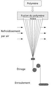 La fibre de nylon est fabriquée par un procédé de filage à l’état fondu. En fonction du type de fil souhaité, épais ou très fin, les fibres sont associées entre elles pour former un fil, en les torsadant par exemple.