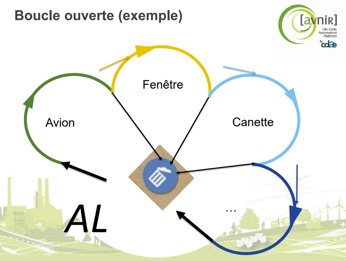 Dans les deux cas, la matière recyclée est utilisée en substitution d’une matière vierge. J’ai trouvé un exemple assez explicite d’une boucle ouverte. Pour que vous compreniez que cela ne signifie pas la fin de vie de la matière :