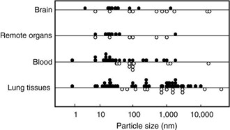 une étude statistique [5] reprend une partie des études réalisées sur l’inhalation de nano et microparticules. Le graphe suivant présente les tailles de particules inhalées et les zones où on les a retrouvées. Les cercles vides signifient qu’elles n’ont pas été détectées.