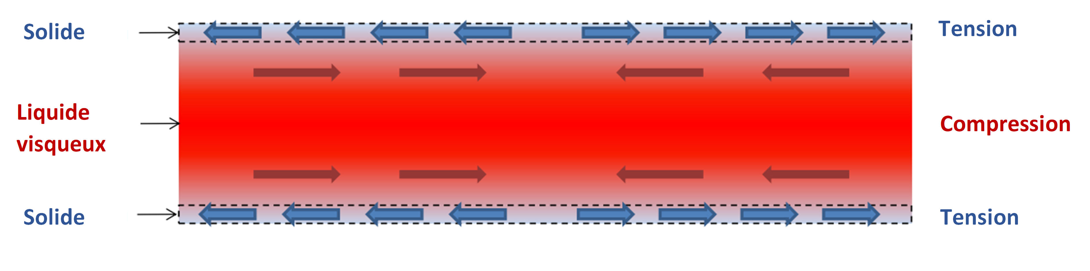 Ainsi, le cœur va se mettre en tension et, par réaction, la surface se mettra en compression. Ces forces s’annulent au point O du schéma ci-dessous. La surface hachurée au-dessus de la ligne (zone en tension) est égale à celle au-dessous de la ligne (zone en compression).