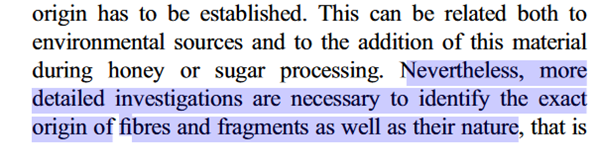 ❌ Le sucre et le miel : l’article utilisé n’identifie pas les particules. Ce sont globalement des fibres, qui peuvent tout aussi bien être des fibres de plastiques ou de cellulose. Il n’y a pas d’analyse chimique mais uniquement une comptabilisation. Et c’est très clairement précisé dans l’article utilisé.