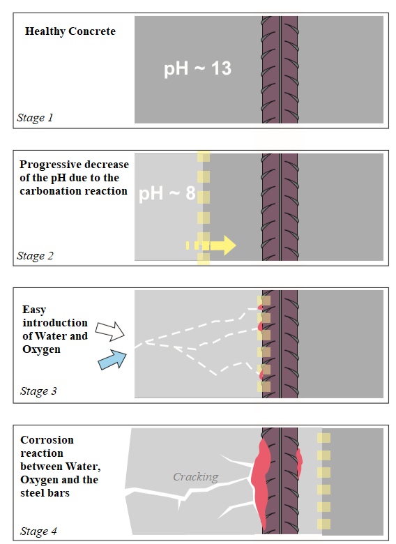 Le pH à la surface du béton va diminuer. Et passer de 13 à 8-9. Ce phénomène permet donc de séquestrer du CO2 par dégradation naturelle du béton. Cette dégradation peut être dommageable si elle atteint les armatures en acier dans le cas du béton armé et si non maitrisée.
