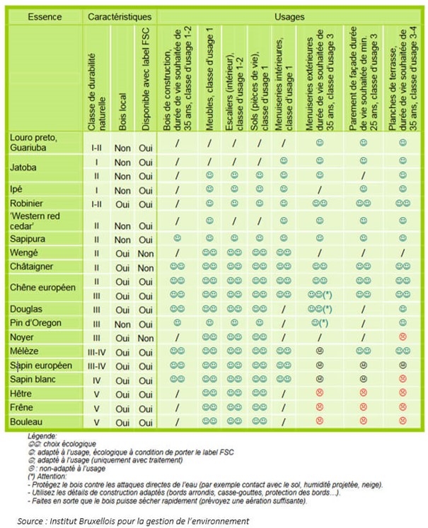 La durabilité du bois est dépendante du choix de l’essence forestière : en fonction de l’exposition (UV, extérieur, intérieur, etc.) la nuance de bois choisie sera déterminante pour sa durabilité. Un mauvais choix impliquera une réduction conséquente de la durabilité de l’ouvrage.