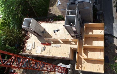 Pour assurer la stabilité de l’immeuble (contreventement) on utilise des cages d’escalier et d’ascenseurs en béton. Cela permet aussi de sécuriser les zones de secours des immeubles. Ce n’est pas nécessaire si l’escalier se trouve à l’extérieur. Exemple ici (source photo : Le Moniteur).