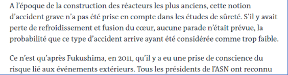 Ce qui pourrait aller dans le sens de M Laponche, c’est de préciser, qu’effectivement à la construction des centrales il n’y avait pas de matériels spécialement dédiés à la gestion d’un accident grave (contrairement à aujourd’hui).