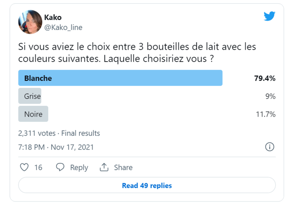 Ce sondage vient d’une discussion sur les emballages fabriqués à partir de matières recyclées, mal perçus pour des questions esthétiques. J’ai pris ici l’exemple de la bouteille de lait en plastique. Il y a encore beaucoup de travail pour changer notre perception des produits fabriqués à partir de matières recyclées.