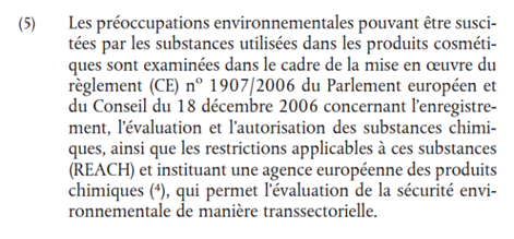 Mais il faut considérer ce règlement en coexistence avec le règlement REACH sur les produits chimiques : les constituants de produits cosmétiques peuvent devoir être enregistrés dans le cadre de REACH et s’y conformer. Comme précisé sur le site de l’ECHA.