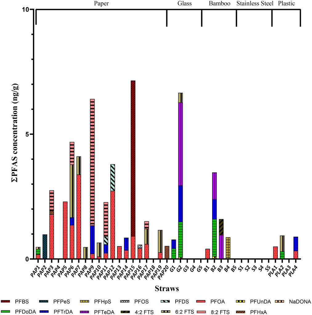 L’étude est réalisée sur 39 pailles différentes en papier, bambou, verre, acier inoxydable et PLA (plastique biosourcé et biodégradable). 29 types de PFAs ont été analysés. Voici les résultats :